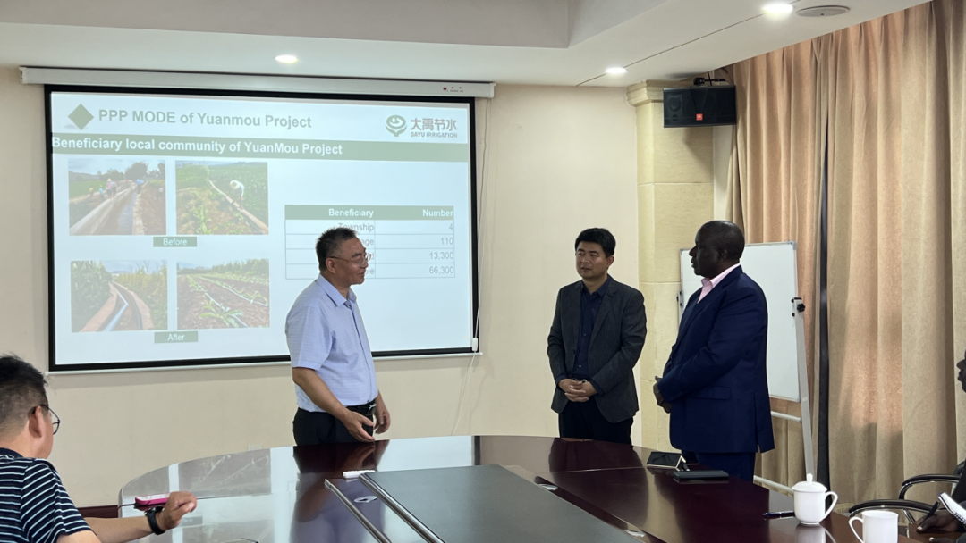 大禹节水集团首席科学家、研究院院长高占义先生详细介绍了大禹节水云南元谋项目的概况。部长先生对元谋项目表现出了极大的兴趣,希望元谋项目模式也可以在赞比亚落地实施。高院长对部长的相关问题逐一进行了详细解答。