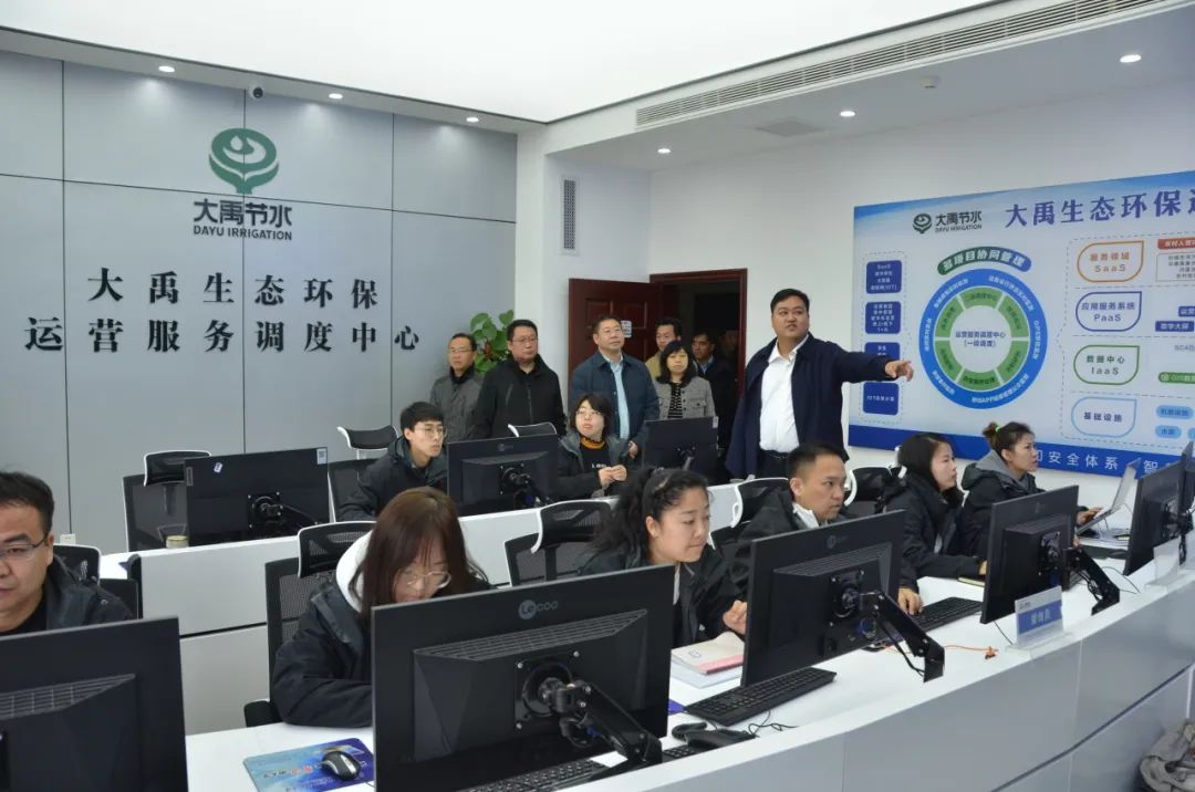 在大禹节水产业园,蒋牧宸主任一行先后考察调研了大禹节水产业园文化展厅、运营调度中心、智能测控设备制造车间、现代化智慧灌区模拟示范中心、现代化灌区量测装备制造车间以及精量灌溉装备制造车间等多个区域。通过实地考察,全面了解了大禹节水集团的发展历程、大禹节水产业园区的建设及运营情况。