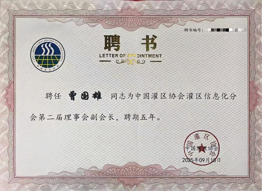 会议期间,中国灌区协会灌区信息化分会完成换届工作。经审议,曾国雄受聘为该分会第二届理事会副会长,任期五年。此项聘任既体现了行业对其专业能力的认可,也反映了对大禹节水集团在灌区信息化领域实践成果的肯定。
