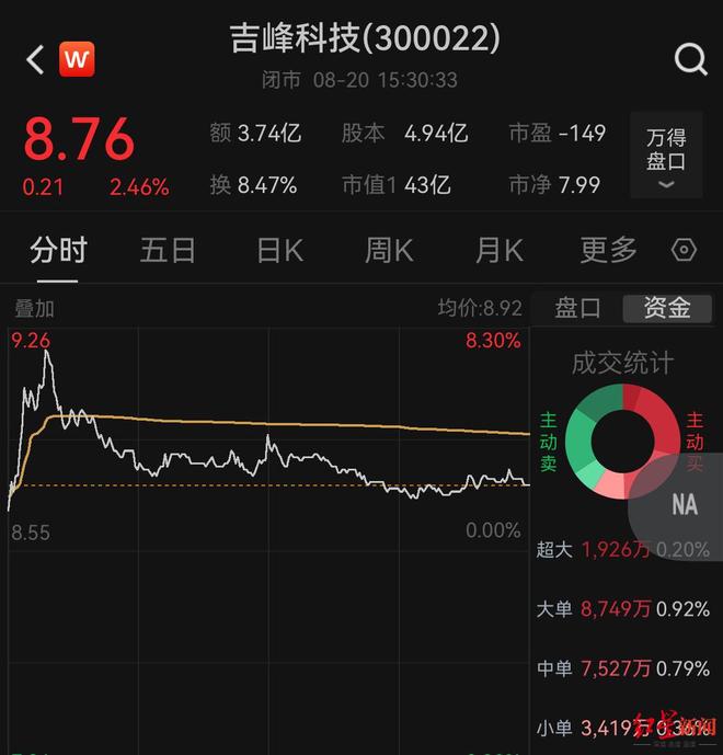 二级市场方面,上述公告发布后,截至8月20日收盘,吉峰科技股价报8.76元/股,涨幅2.46%,市值43亿元。