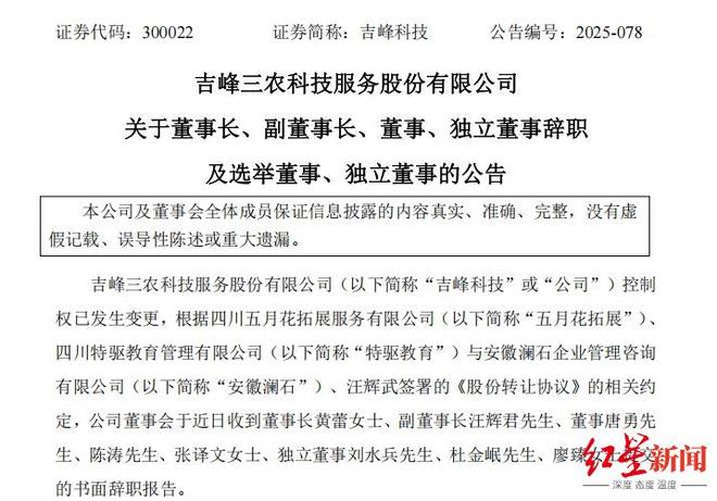微成都报道农机流通行业龙头企业吉峰科技(300022.SZ)实控权易主后,高层也随之迎来“大换血”。