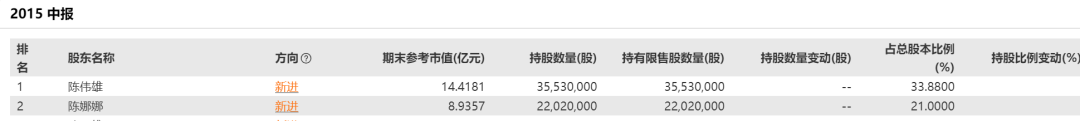 截至目前,陈伟雄、陈娜娜持有公司股份加起来不到30%,相比上市初期二人合计持有的超过57%的股份,已减持近半。