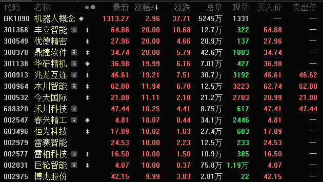 有分析指出,机器人方向近期的持续走强不仅仅是因为受到消息面密集催化,更为重要的是被资金赋予了AI主线退潮下题材过渡的意义。从今天盘面看,板块赚钱效应已延伸至机器人全产业链。