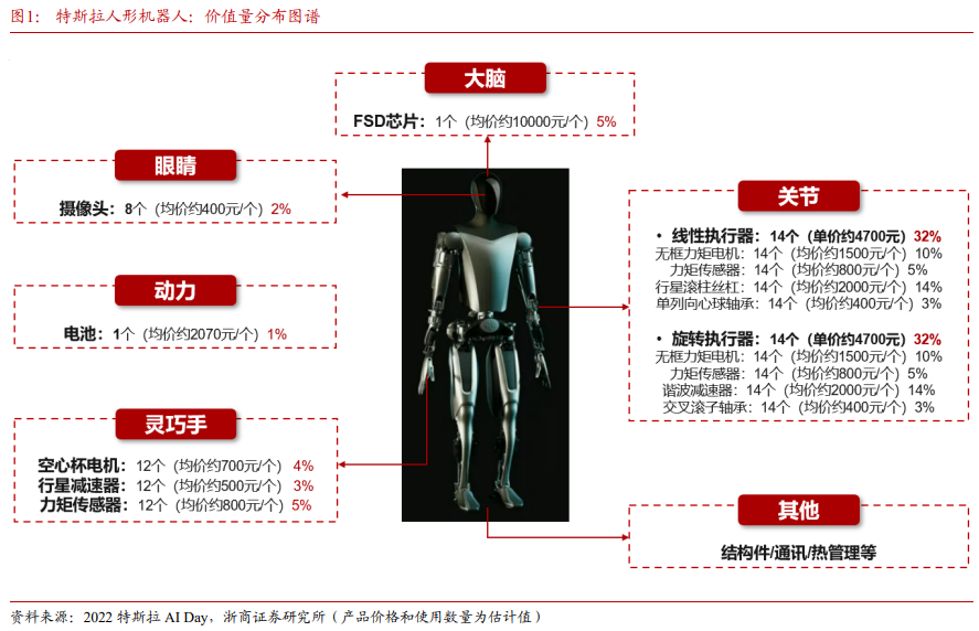 以特斯拉 Optimus 为例,人形机器人感知、执行系统主要部件价值量分布及相关供应商情况,如图: