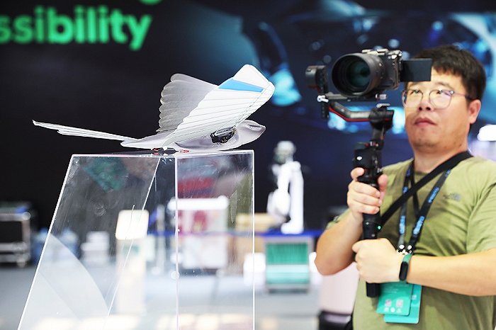 此次大会上,德国机器人公司Festo集团带来了他们仿生机器人家族中的仿生雨燕,这是该产品首次亮相世界机器人大会。仿生雨燕体长44.5厘米,翼展68厘米,体重仅42克,翅膀以鸟类的羽翼为原型,可在定义的空域内实现协调、自主的群体飞行。