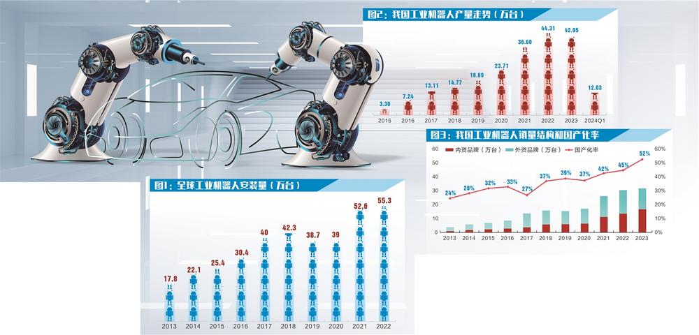 作为制造业大国,我国对工业机器人的需求十分旺盛。自2013年以来,我国工业机器人市场销量连续11年居世界首位,目前已占全球销量的一半以上。从基础研究到产业化落地,我国工业机器人产业规模日渐壮大,国产化格局已站在量变到质变的拐点。根据高工产业研究院(GGII)最新统计数据,2023年国产工业机器人市场份额达到52.45%,从销量口径上首次实现对外资品牌的反超。