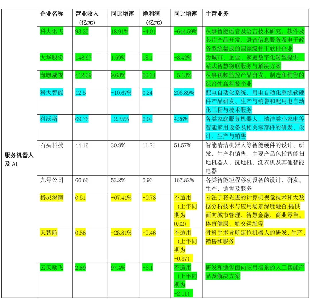 注:数据均来自上述公司2024上半年财报,其中,整机栏*代表非机器人业务占比较大;表格未标颜色为双增;黄色为双降;蓝色为营收增速下降;绿色为净利润增速下降