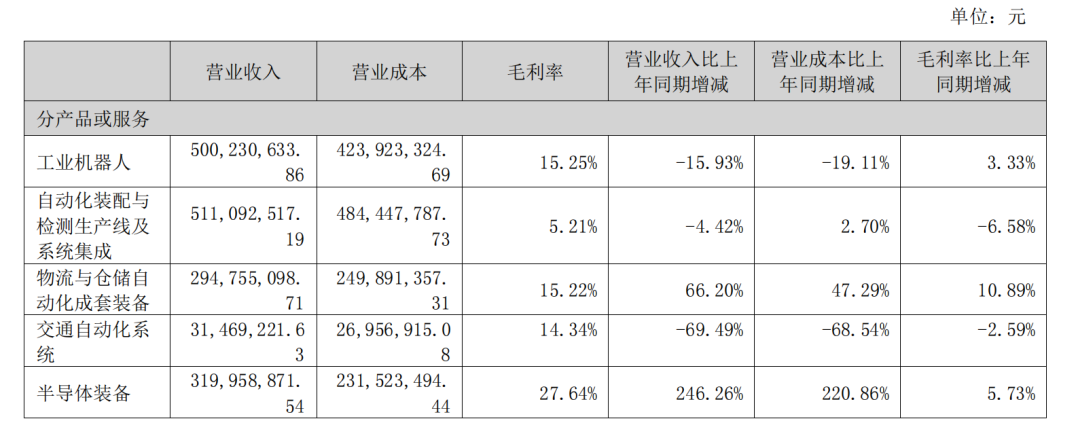 相较而言,工业机器人和自动化装配与检测生产线业务的营业收入则有所滑落,分别为 5 亿元与 5.11 亿元,同比分别下降 15.93%和 4.42%。