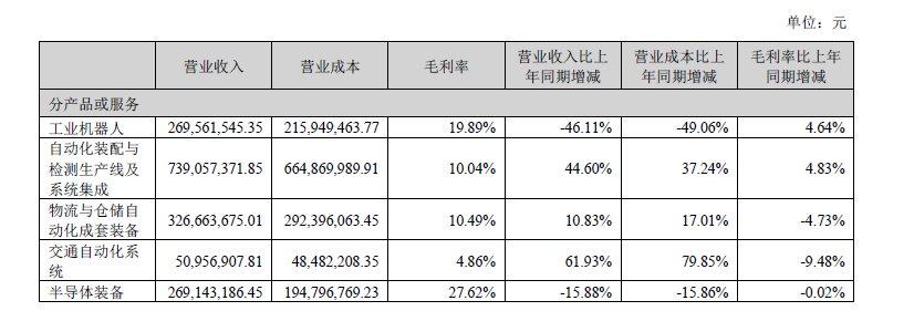 其传统强势的工业机器人业务营收仅为2.70亿元,同比大幅下降46.11%,近乎“腰斩”。形成鲜明对比的是,公司系统集成及解决方案相关业务却稳步增长,自动化装配与检测生产线及系统集成业务营收7.39亿元,同比增长44.60%;物流与仓储自动化成套装备营收3.27亿元,同比增长10.83%;交通自动化系统营收5095.69万元,同比增长61.93%。