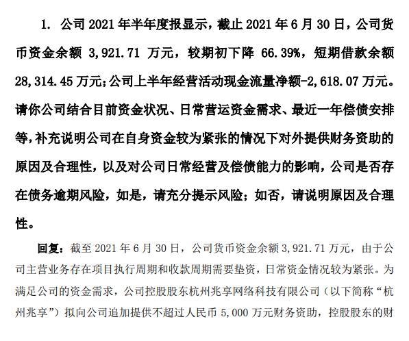 此举还引起深交所关注,并向华星创业发出问询函。在问询函中,深交所称,华星创业2021 年半年度报显示,截止 2021 年 6 月 30 日,公司货币资金余额 3,921.71 万元,较期初下降 66.39%,短期借款余额28,314.45 万元;公司上半年经营活动现金流量净额-2,618.07 万元。请公司结合目前资金状况、日常营运资金需求、最近一年偿债安排等,补充说明公司在自身资金较为紧张的情况下对外提供财务资助的原因及合理性,以及对公司日常经营及偿债能力的影响,公司是否存在债务逾期风险,如是,请充分提示风险;如否,请说明原因及合理性。