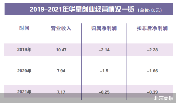 在拿到热门IP授权背后,华星创业正面临着不小的业绩压力。公司归属净利润已连亏三年。财务数据显示,2019-2021年,华星创业实现的营业收入分别约为10.47亿元、7.94亿元、7.17亿元;对应实现的归属净利润分别约为-2.14亿元、-1.5亿元、-2468.03万元。
