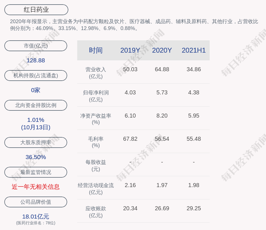 2020年年报显示,红日药业的主营业务为中药配方颗粒及饮片、医疗器械、成品药、辅料及原料药、其他行业,占营收比例分别为:46.09%、33.15%、12.98%、6.9%、0.88%。