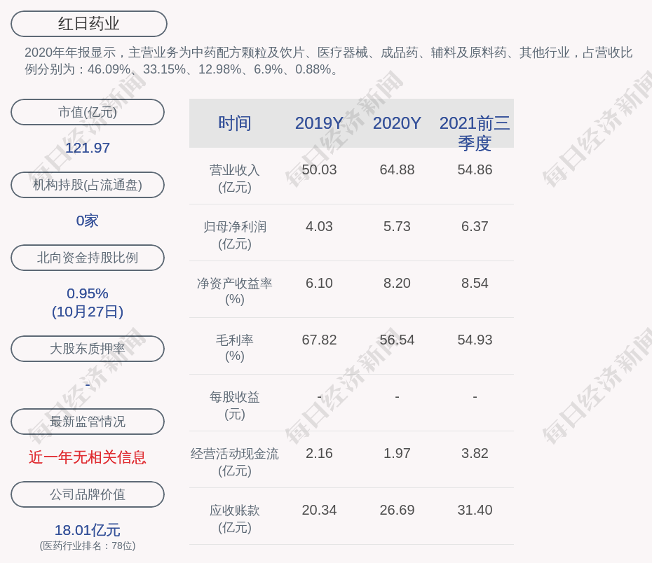 2020年年报显示,红日药业的主营业务为中药配方颗粒及饮片、医疗器械、成品药、辅料及原料药、其他行业,占营收比例分别为:46.09%、33.15%、12.98%、6.9%、0.88%。
