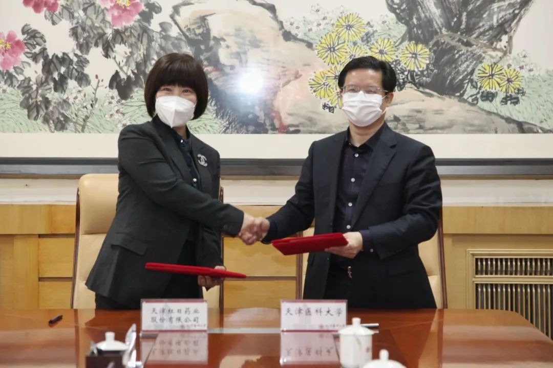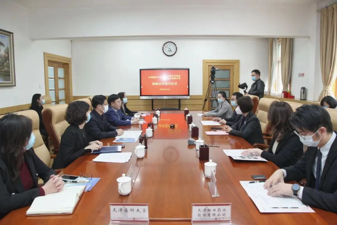 红日药业品牌部总监苏玉,公共事务总监朱司宇,研究院立项副总监赵腾飞,公共事务委员会办公室主任韩晴;天津医科大学党委统战部部长、天津校友会会长黄国伟,校长办公室主任卫丽君,科技处处长陈可欣,战略发展研究办公室副主任陈洁莉等领导出席签约仪式。