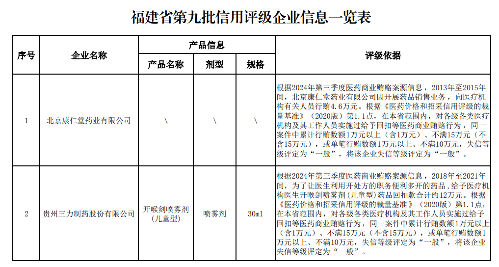 根据《福建省医疗保障局关于建立医药价格和招采信用评价制度的通知》(闽医保〔2021〕1号)有关规定,现对下列2家企业予以信用评级,北京康仁堂药业有限公司与贵州三力制药股份有限公司信用评级为一般。