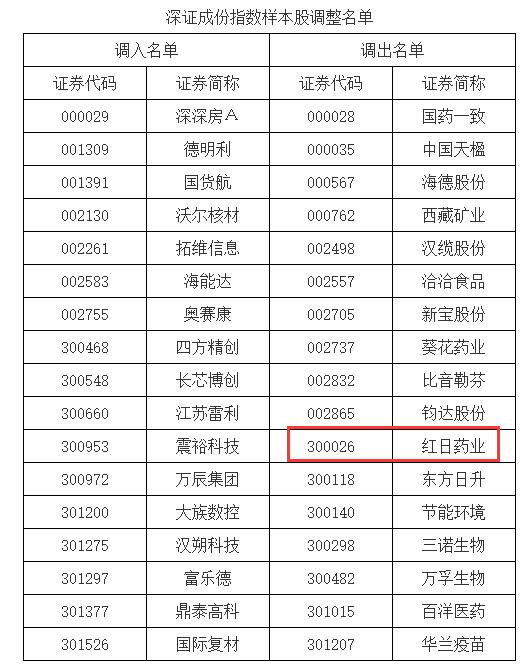 红日药业 (300026)被调出深证成份指数样本股名单。