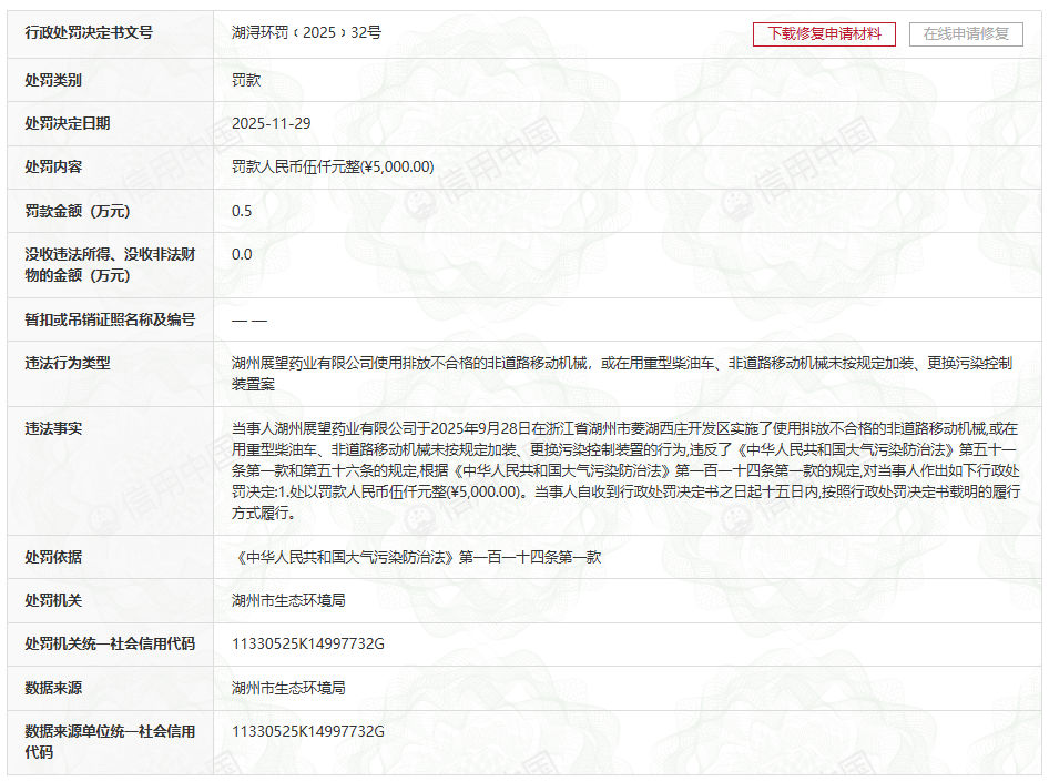 信用中国近期收录了行政处罚决定书(湖浔环罚﹝2025﹞31号)与行政处罚决定书(湖浔环罚﹝2025﹞32号)。