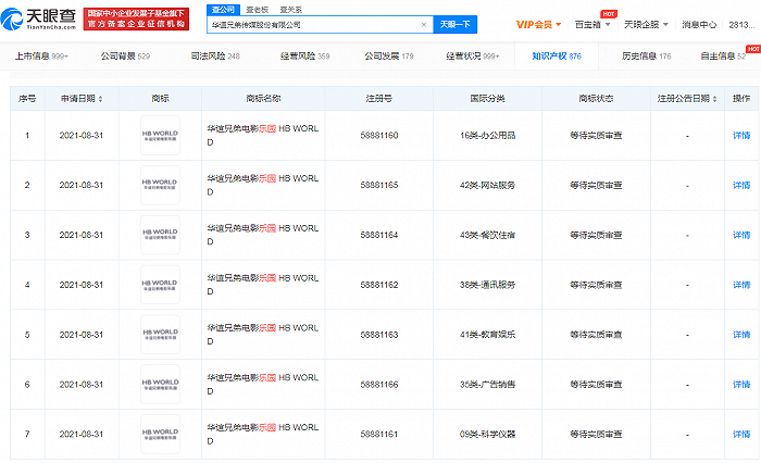 据天眼查APP显示,近期,华谊兄弟传媒股份有限公司申请注册多个“华谊兄弟电影乐园 HB WORLD”商标,国际分类涉及广告销售、教育娱乐等,当前商标状态均为等待实质审查。