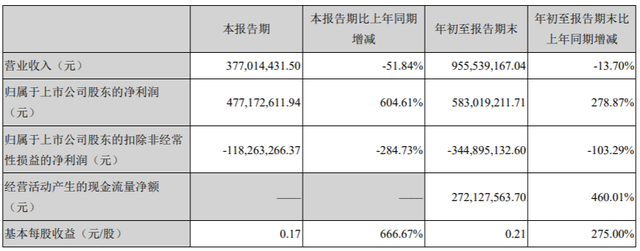 公司前三季度实现营业收入约9.56亿元,同比下降13.7%;前三季度归属于上市公司股东的净利润约为5.83亿元,同比增长278.87%。