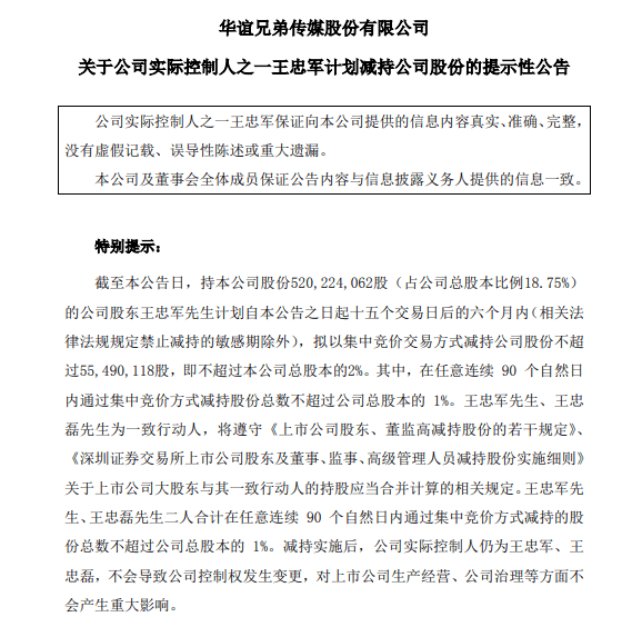 截至公告当日,华谊兄弟实控人王忠军、王忠磊合计共持有华谊兄弟股份约6.18亿股,占公司总股本的22.27%;如本次减持计划最大限度实施后,王忠军、王忠磊合计持股比例将降低至20.27%,但仍为公司实际控制人。