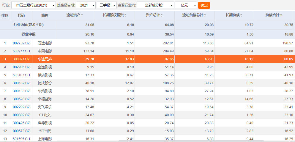 Choice数据显示,截至2021年第三季度末,华谊兄弟的负债总额为60.05亿元,资产负债率为61.37%,在申万二级行业(2021)给出的22家传媒公司中位列第3位。