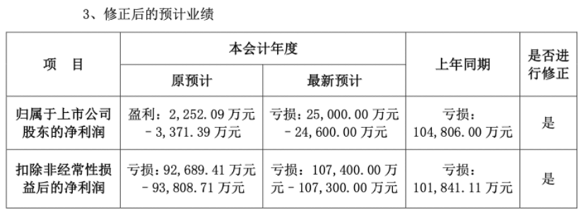 结果4月27日连同财报一起发布了一份关于2021年年度业绩预告修正的公告。修正后的预计业绩为亏损2.46亿元-2.5亿元。