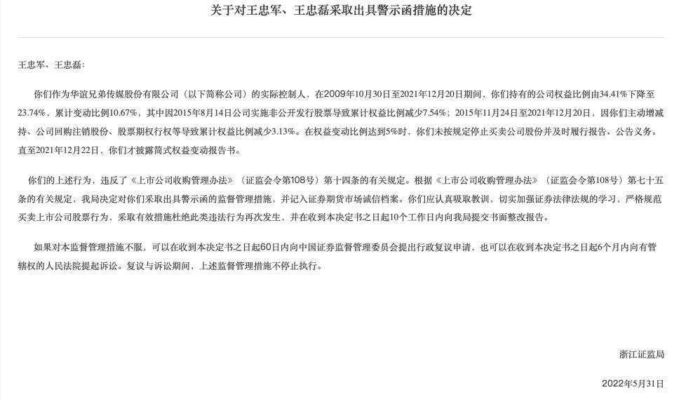 6月6日,浙江证监局披露《关于对王忠军、王忠磊采取出具警示函措施的决定》。决定书称,王忠军、王忠磊二人作为华谊兄弟的实际控制人,在2009年10月30日至2021年12月20日期间,二人持有的公司权益比例由34.41%下降至23.74%,累计变动比例10.67%,其中因2015年8月14日公司实施非公开发行股票导致累计权益比例减少7.54%;2015年11月24日至2021年12月20日,因二人主动增减持、公司回购注销股份、股票期权行权等导致累计权益比例减少3.13%。在权益变动比例达到5%时,二人未按规定停止买卖公司股份并及时履行报告、公告义务。直至2021年12月22日,二人才披露简式权益变动报告书。