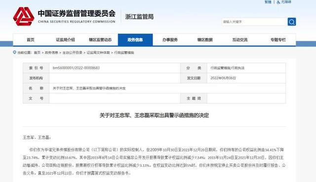 6月6日,浙江证监局网站披露《关于对王忠军、王忠磊采取出具警示函措施的决定》。决定书称,王忠军、王忠磊二人作为华谊兄弟传媒股份有限公司的实际控制人,在2009年10月30日至2021年12月20日期间,二人持有的公司权益比例由34.41%下降至23.74%,累计变动比例10.67%。