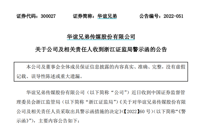 6月23日晚间,华谊兄弟传媒股份有限公司(以下简称为“华谊兄弟”,证券代码:300027.SZ)公告称,近日收到中国证券监督管理委员会浙江监管局(以下简称“浙江证监局”)出具的警示函。
