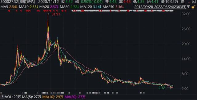除了业绩下滑,华谊兄弟在A股市场上的表现也大不如前。华谊兄弟股价曾在2015年最高达到31.91元/股,但随后几年股价一蹶不振,截至今日(6月24日)收盘,华谊兄弟股价为2.53元/股,市值也从2015年巅峰时刻的近千亿元跌至如今的70亿元,缩水超九成。