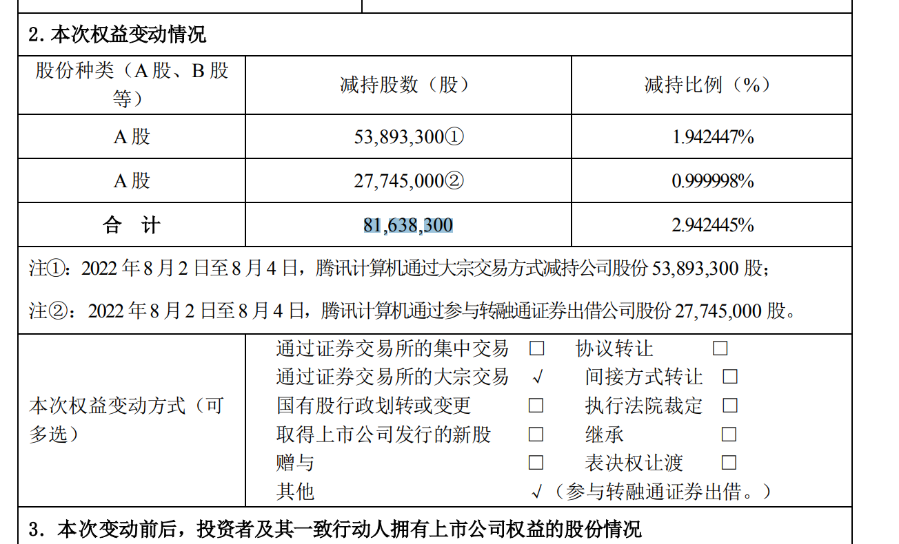 简式权益变动报告书显示,因股票期权行权、限制性股票授予登记导致腾讯计算机持股比例被动稀释。因上市公司回购注销业绩补偿股份导致腾讯计算机拥有权益的股份比例减少。因限制性股票回购注销导致腾讯计算机持股比例被动增加。腾讯计算机根据自身需要,通过深圳证券交易所的大宗交易系统减持所持上市公司股份、参与转融通证券出借导致腾讯计算机拥有权益的股份比例减少。
