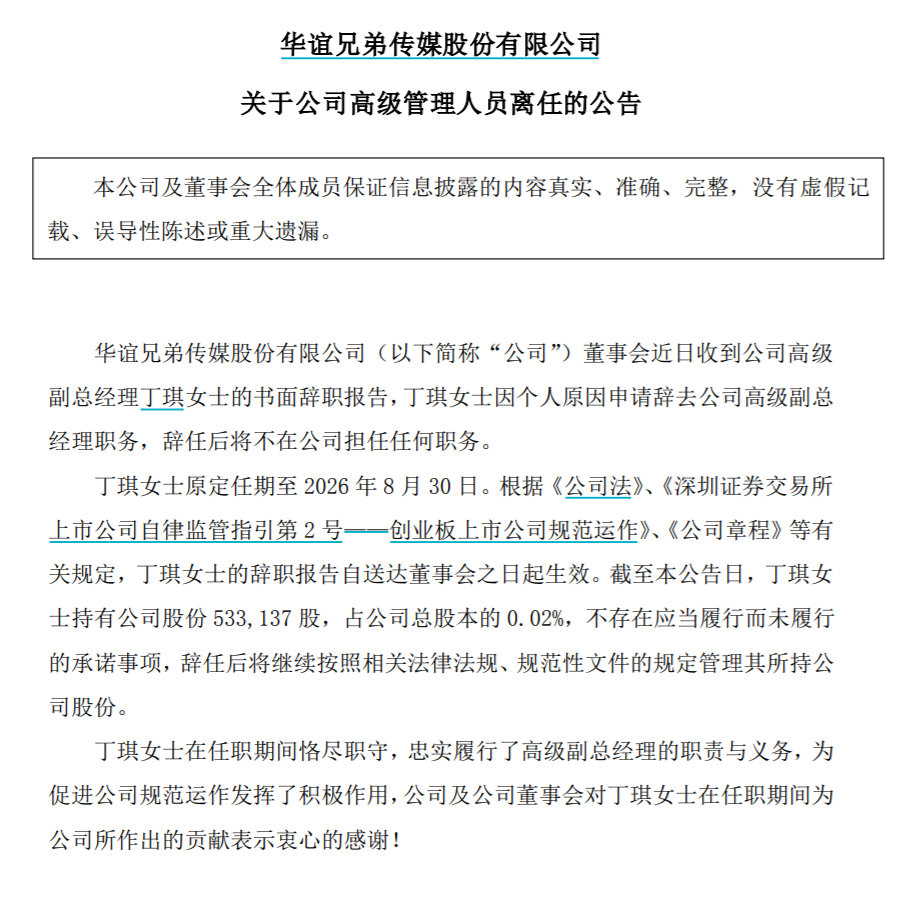 华谊兄弟2日晚间公告,公司高级副总经理丁琪因个人原因辞职,辞任后将不在公司担任任何职务。