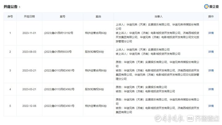 据公开信息显示,2022年12月,华谊兄弟(天津)实景娱乐有限公司、华谊兄弟传媒股份有限公司因特许经营合同纠纷将华谊兄弟(济南)电影城投资开发有限公司、济南西城投资开发集团有限公司告上法庭。据查询,2022年12月至2023年11月,双方因特许经营合同纠纷、股东知情权纠纷五次开庭。
