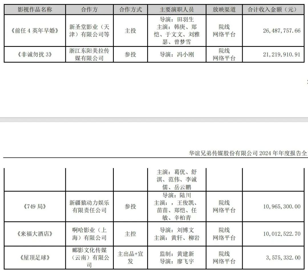2025年,公司有近20部电影计划上映。其中,冯小刚导演、赵丽颖主演、公司参投的《向阳·花》,已于4月4日登上大银幕,目前票房收入约1.9亿元,平台预测总票房约在2.3亿元。