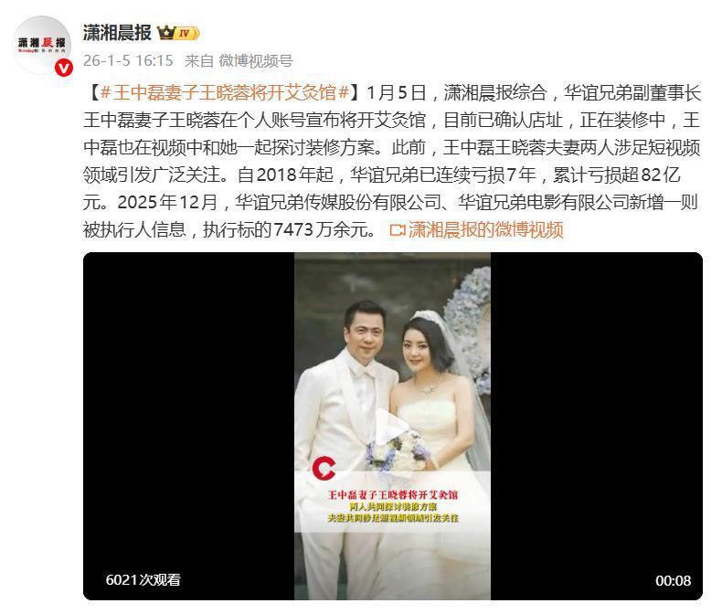据 1 月 5 日报道,华谊兄弟副董事长王中磊的妻子王晓蓉,在个人社交账号上宣布了一个新动向:她要开一家艾灸馆。消息一出,迅速在网络上引发热议。毕竟,这对夫妇身后的华谊兄弟,正深陷连续七年亏损、累计超 82 亿元的泥潭,王中磊本人近期还新增了数千万元的被执行信息。网友不禁感慨:"这是豪门太太也要下场搞实业,补贴家用了?"