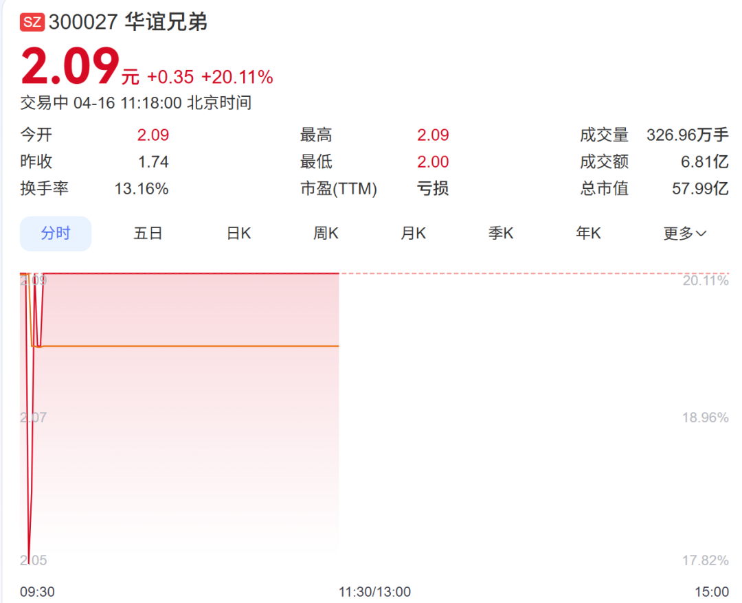 16日,华谊兄弟开盘“20cm”涨停,随后其股价略有调整,截至发稿再次封住涨停,报2.09元/股。