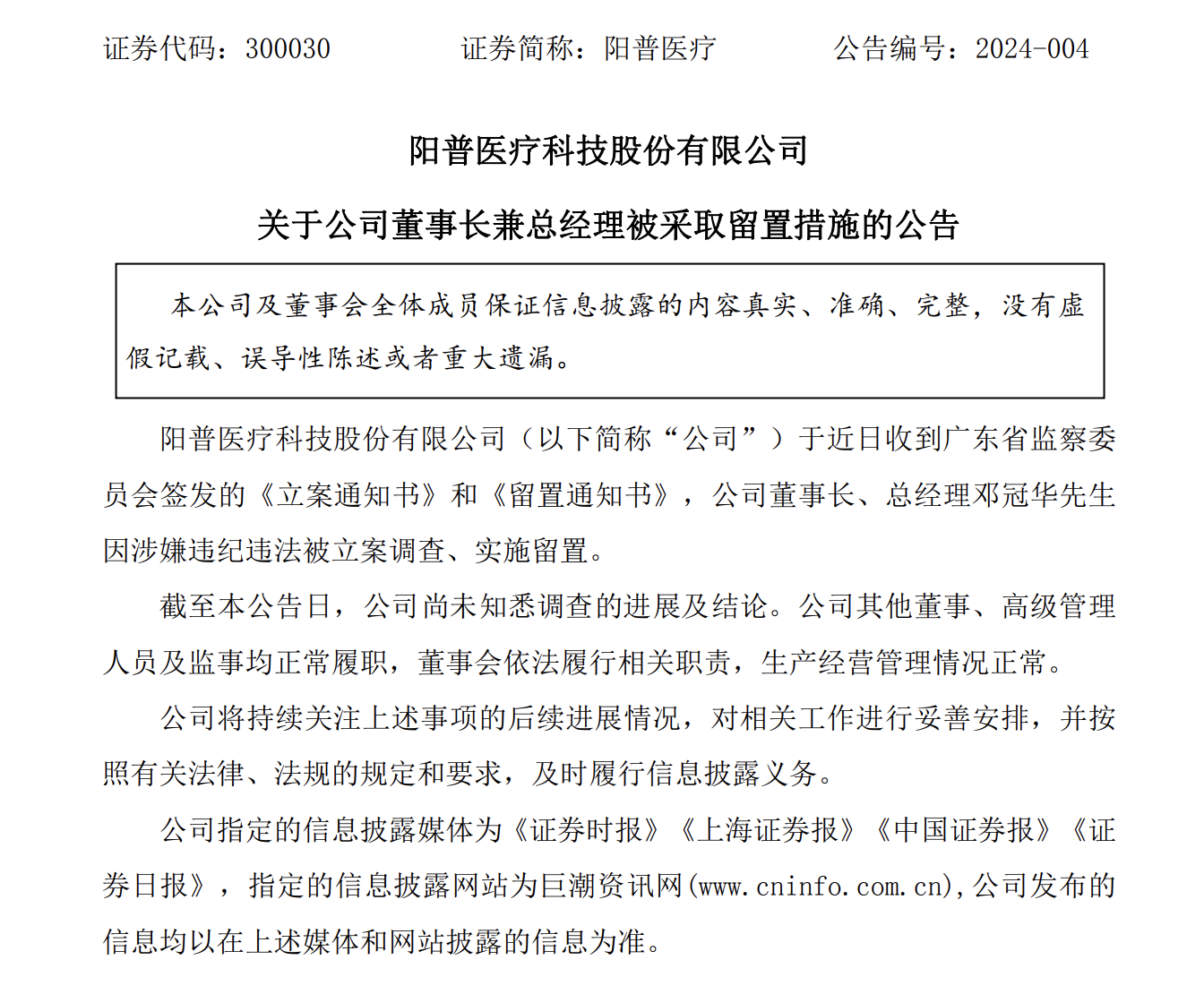 消息面上,4月7日晚间,阳普医疗突发公告称,公司于近日收到广东省监察委员会签发的《立案通知书》和《留置通知书》,公司董事长、总经理邓冠华因涉嫌违纪违法被立案调查、实施留置。阳普医疗表示,公司尚未知悉调查的进展及结论。