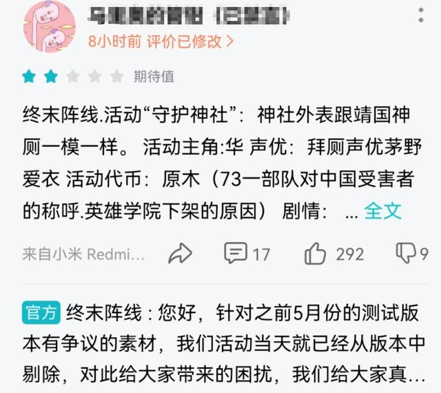 据游戏日报了解,这一问题最早出现在今年5月份。当时《终末阵线:伊诺贝塔》给了B站独家代理运营,测试期间被玩家发现某个活动中游戏场景的设计疑似日本某神社。事后,《终末阵线:伊诺贝塔》下架活动并在B站发布了道歉声明(目前B站已不再是其运营商)。