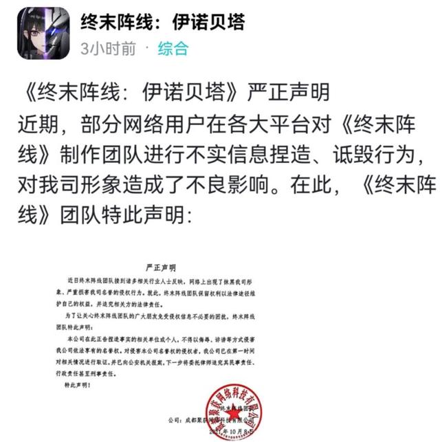 目前《终末阵线:伊诺贝塔》官方已发出声明,称外界不实信息捏造和诋毁的行为严重影响了公司形象,已向公安机关报案。