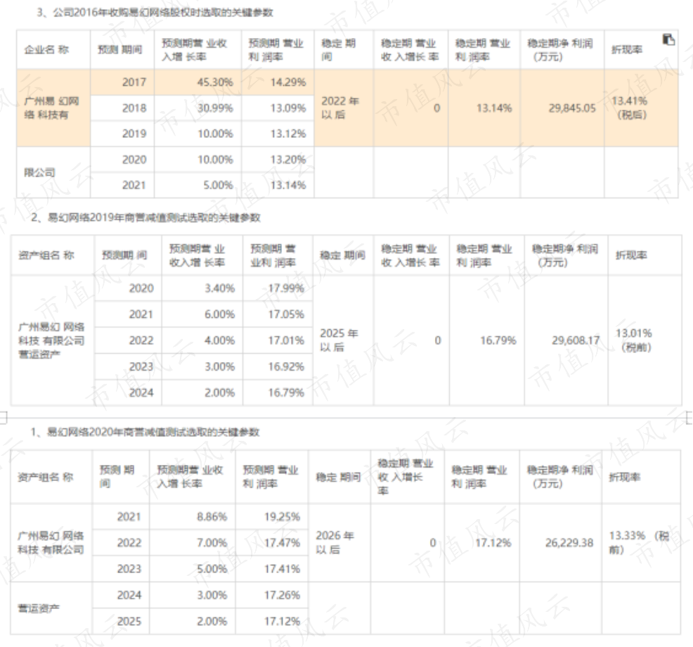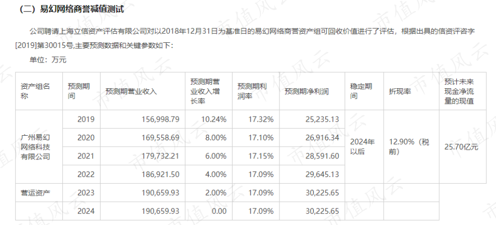 根据2018年资产评估公司对易幻网络的商誉减值测试分析,2020、2021、2022年的预期净利润应达到2.7亿、2.85亿、2.96亿。