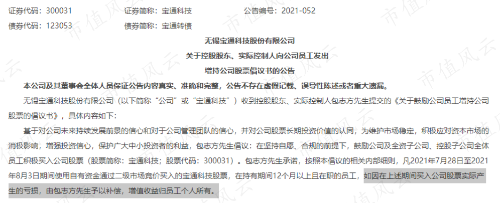 2021年7月28日,就在减持后的一个月,包志方发出员工增持公司股票的倡议,并承诺兜底。