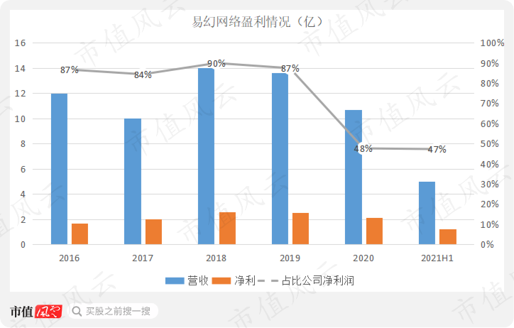 对比之下,2020年易幻网络净利润仅为2.1亿;2021年中报净利润更是同比下滑13%,仅为1.2亿。