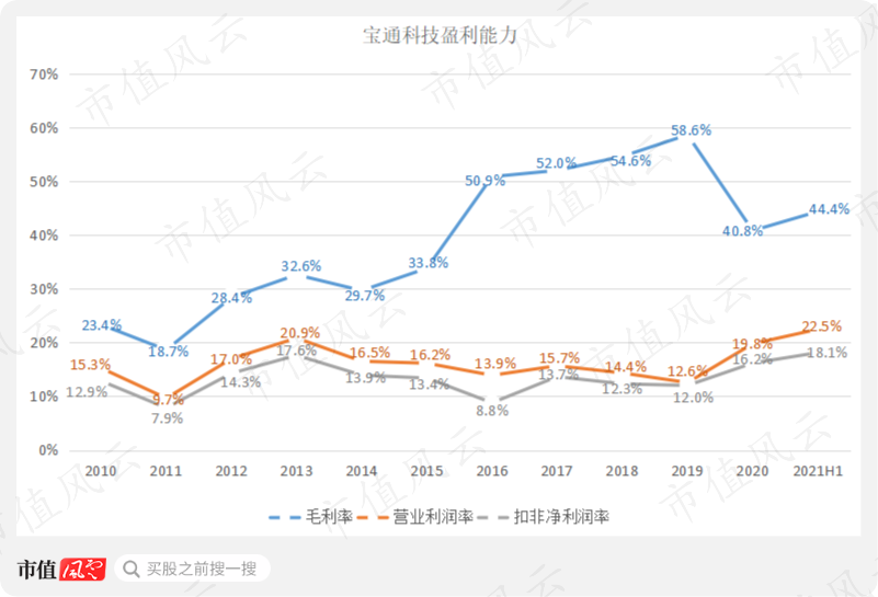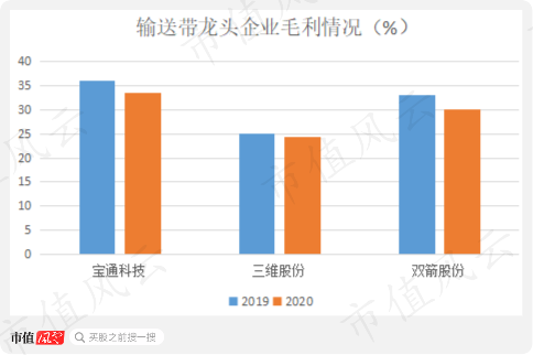 宝通科技输送带业务的利润率在行业中也是相对较高的。2019、2020年毛利率分别为36%、33%。