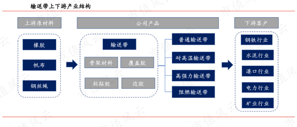 输送带行业上游主要原材料有橡胶、帆布和钢丝绳,下游客户包括钢铁、水泥、港口、电力、矿业和煤炭等行业。