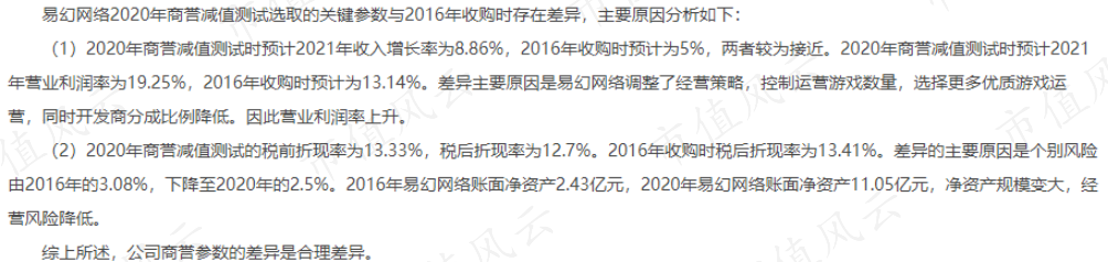 但让风云君感到奇怪的是:在2019和2020年易幻网络营业收入连年下滑的情况下,公司还于2020年商誉减值测试调整中调高了预测期营业收入增长率。