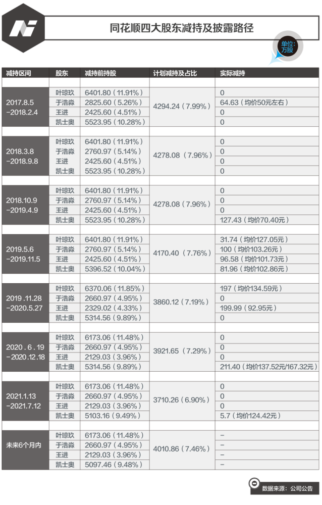 同花顺此次公告与以往类似,即在披露相关股东上一期减持计划实施结果的同时,公布了下一期减持计划。其中,公司大股东、董事叶琼玖,股东上海凯士奥信息咨询中心(有限合伙)、董事于浩淼及董事王进拟自公告日起15个交易日后的六个月内,以集中竞价交易或大宗交易方式合计减持公司股份不超过4010.86万股,占公司总股本的7.46%。