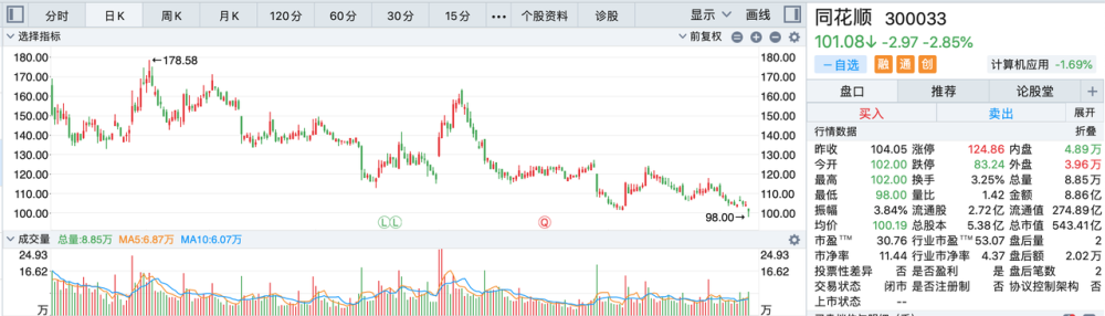 7月15日,同花顺股价开盘后迅速下跌,盘中一度跌近6%,股价触及98.00元的新低,截至收盘股价报101.08元。