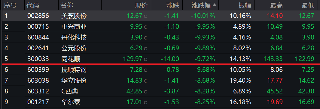 Wind数据显示,同花顺当日跌幅居A股所有上市公司前5名。