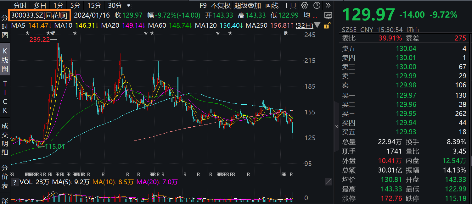 1月16日,同花顺(300033.SZ)股价大跌,截至当日收盘,公司股价以下跌9.72%报收129.97元,公司市值约为699亿元。