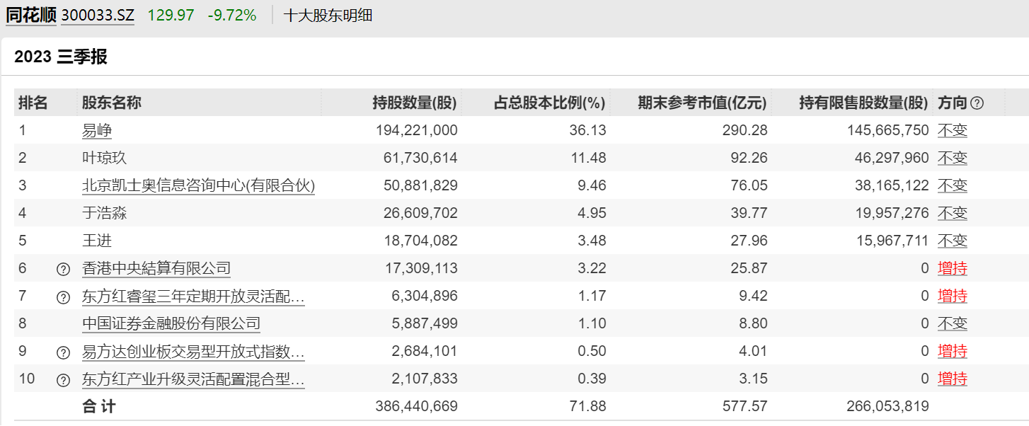 公开资料显示,同花顺于2009年在深交所上市,是国内领先互联网金融信息服务提供商。主要为国内外机构客户提供软件产品、金融数据服务和智能推广服务,及个人投资者提供金融资讯和投资理财分析工具。客户包括券商、基金、私募、银行、保险、政府、科研院所、上市公司以及个人投资者。公司法定代表人和实际控制人均为易峥。